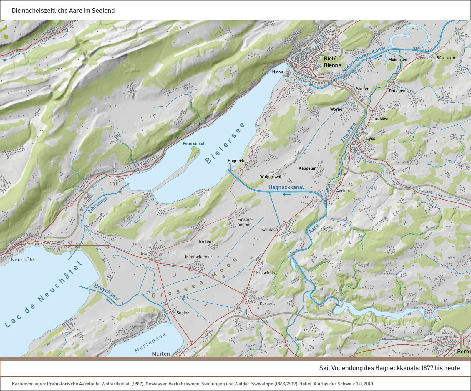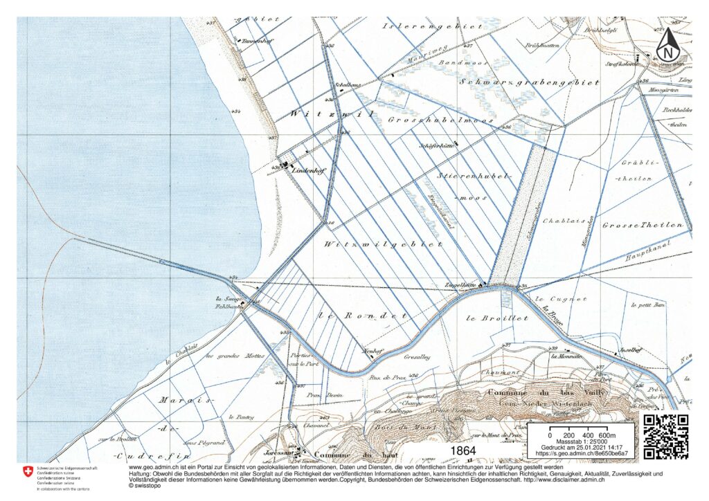 Um den Sumpf in Ackerland umzuwandeln, werden die Pegel von Bieler-, Murten und Neuenburgersee einander angeglichen und um rund 2.5 m abgesenkt.